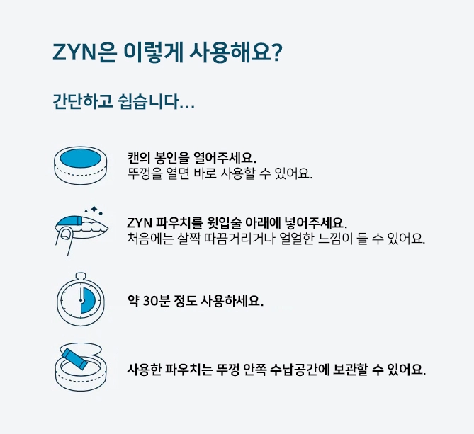 ZYN은 연기나 증기 없이 니코틴을 섭취할 수 있도록 설계된 무연 니코틴 파우치 제품으로, 담배나 전자담배 없이 니코틴을 원하는 소비자들을 위해 만들어졌는 제품이예요.